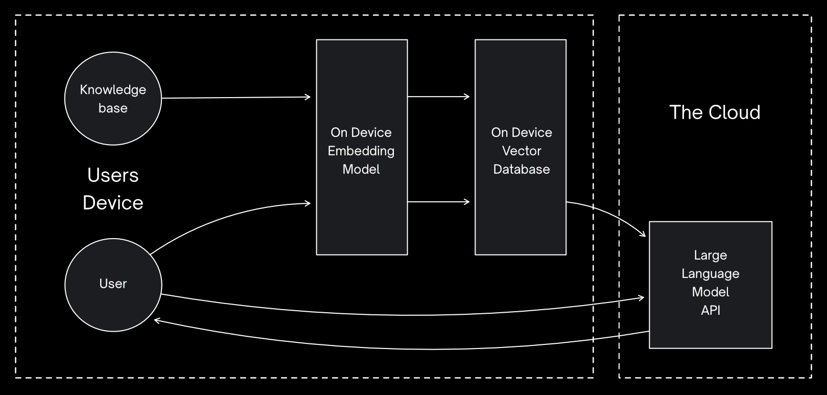 As the embedding models are significantly smaller, it is possible to have a hybrid model where the embedding model and vector database are on the user’s device, whereas the LLM is provided by a cloud API.