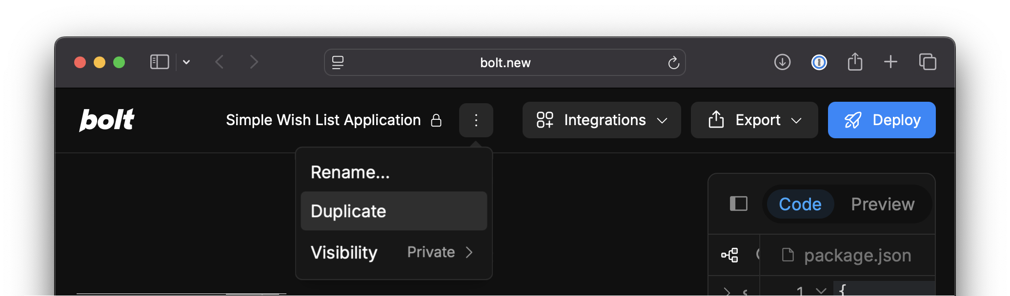 For example, using Bolt, you can click a button to fork, aka duplicate, your application: