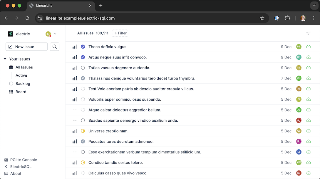 This demonstrates a fully-interactive, offline capable, real-world app with a large data set. It shows both fast initial data loading and instant local reactivity, despite a very large data set loaded into the local database.