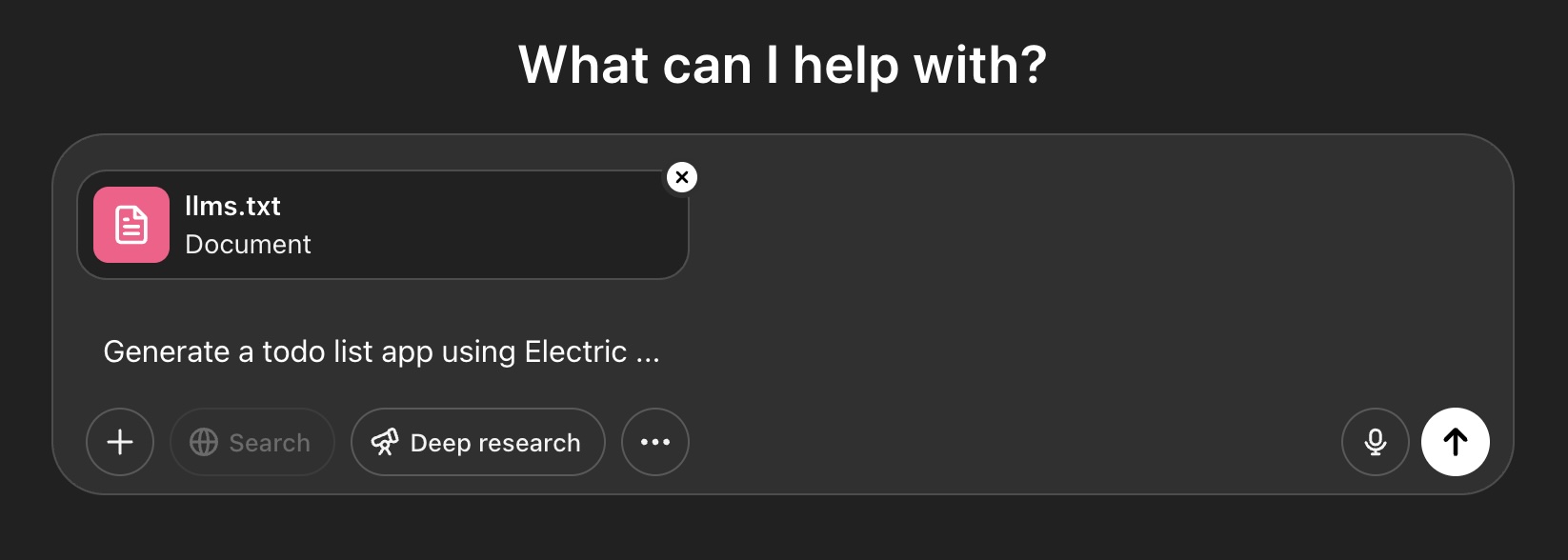 How to use Electric with LLMs like ChatGPT and Claude and AI code editors like Cursor and Windsurf.