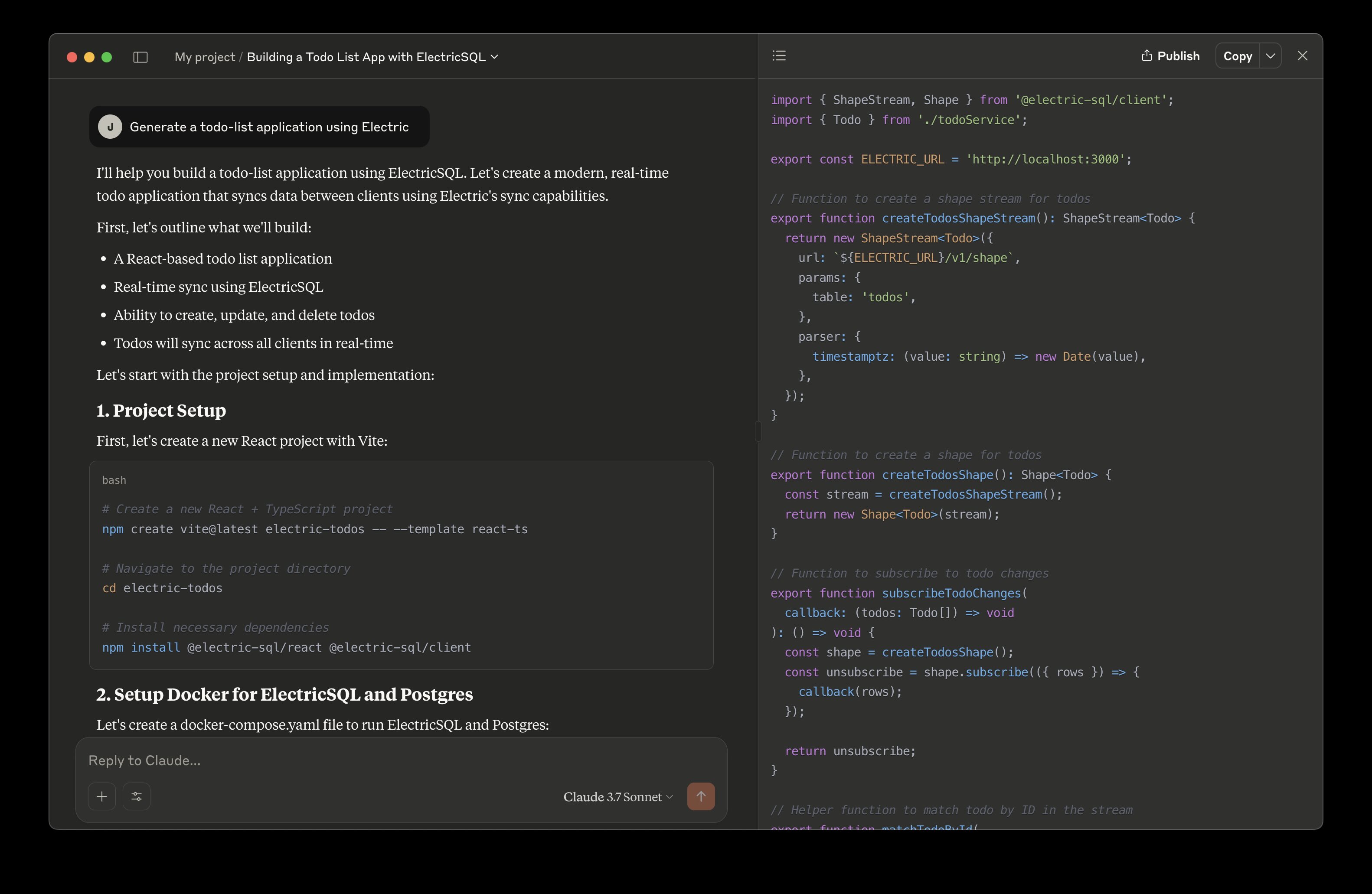 With the llms.txt as context, this will be enough to generate a fully working Electric application. For example, this is Claude's response: