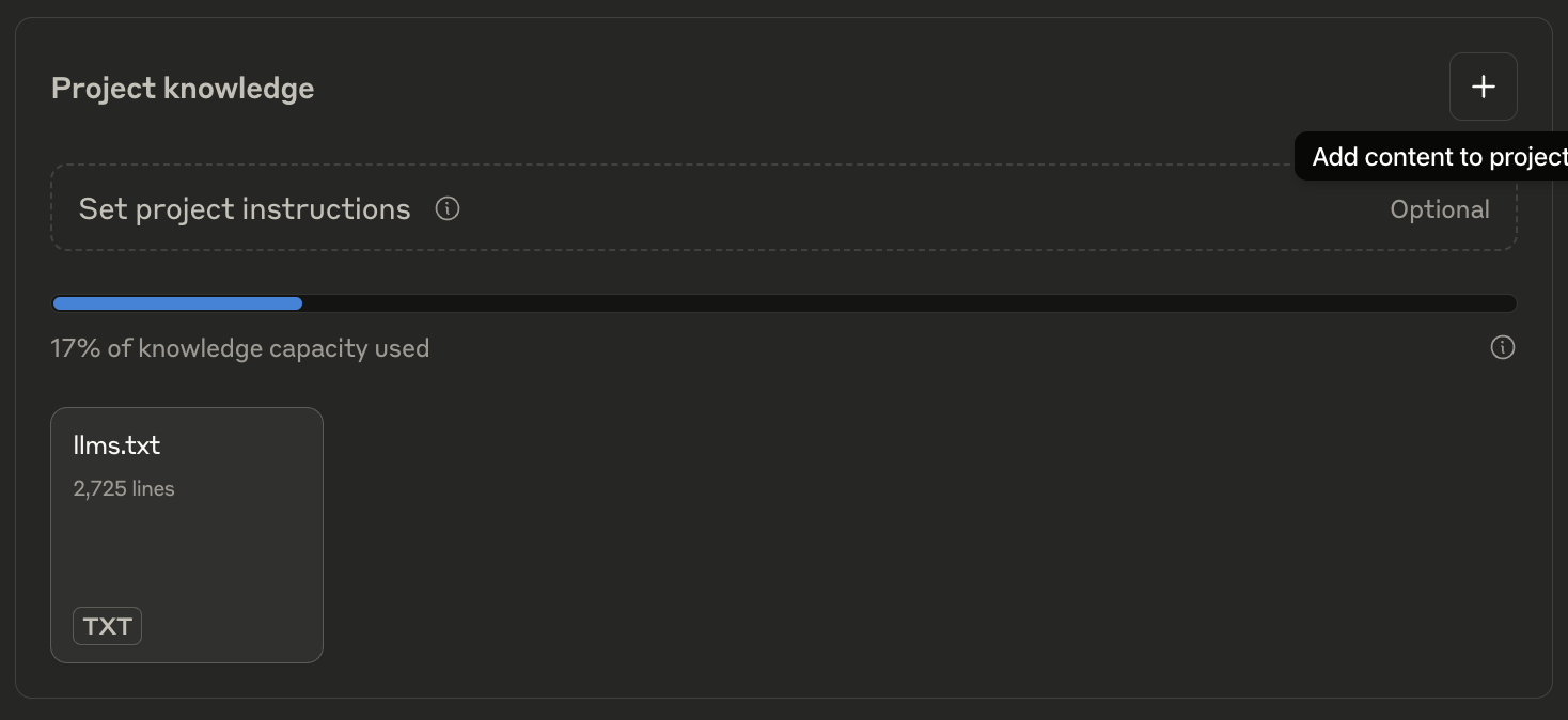 Or, more powerfully, you can create a project and add the llms.txt file to the project context. This means that the instructions within it will be applied to all of the chat sessions you create within the project.