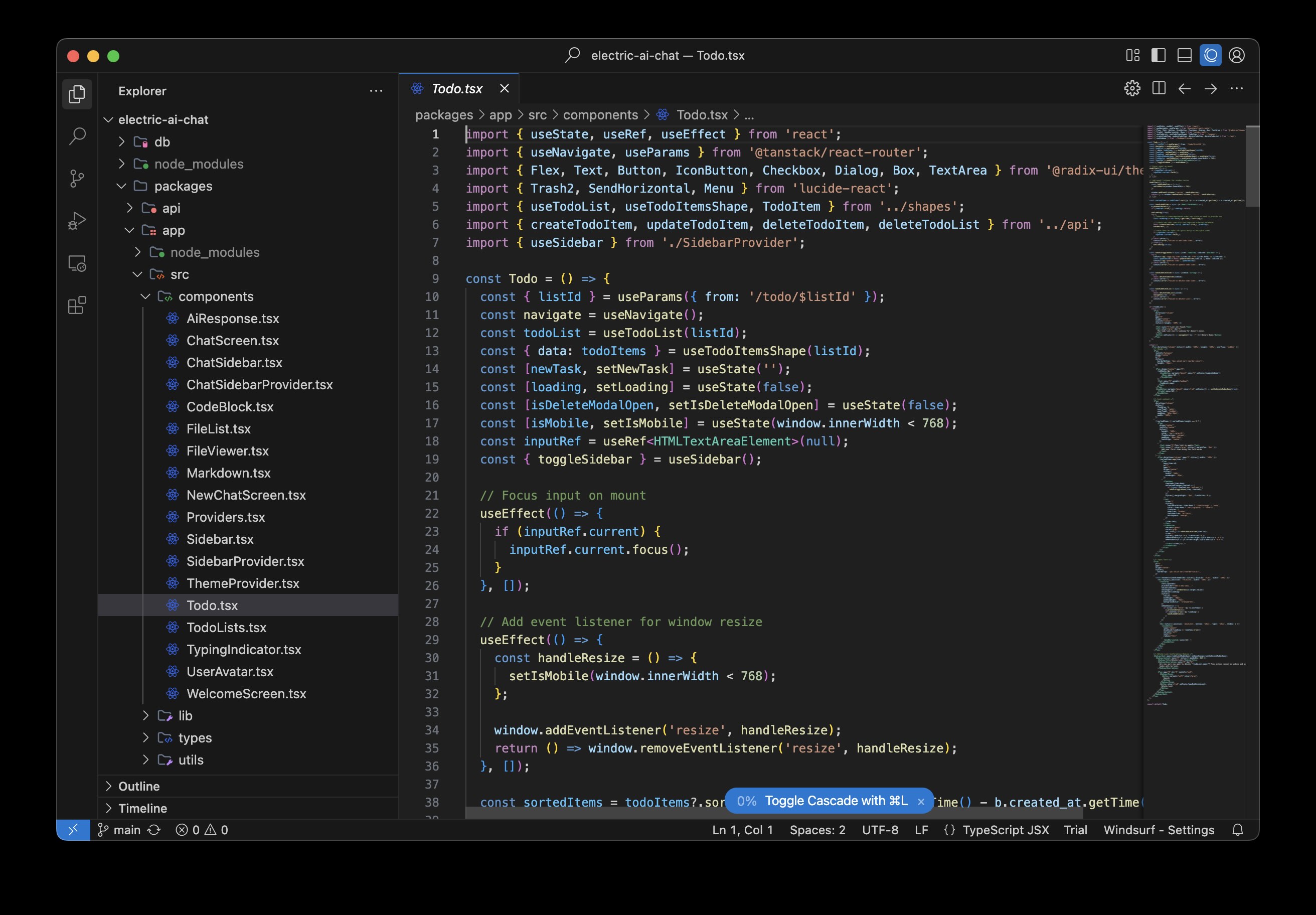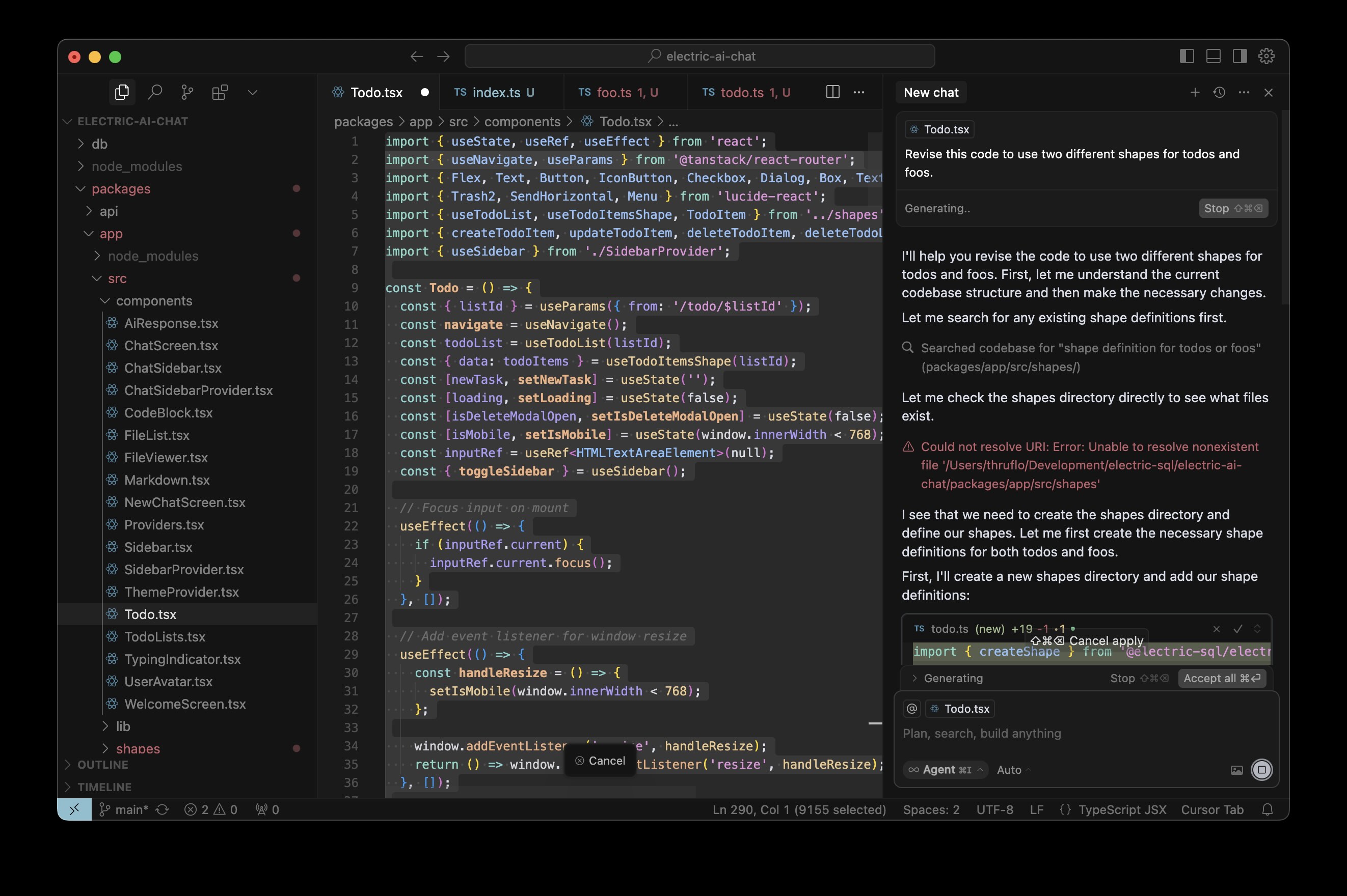 You can then identify existing components or routes that are fetching data and tell the LLM to replace the data wiring with Electric sync. This can typically be achieved by selecting the relevant code and then prompting to revise it.
