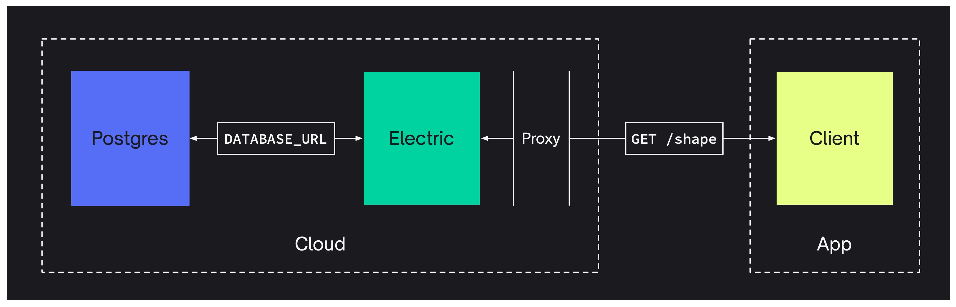 Electric always runs as a service in front of Postgres, syncing into a Client process or store, via a Proxy or backend API.